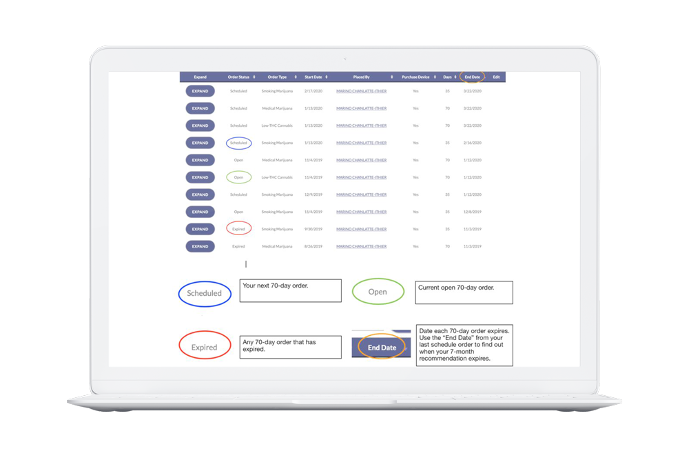 Here you can see the status of all your orders. Also the different routes, milligrams and ending date of all your orders. If the order is open, its under the current 70-day period. It can also be expired or scheduled.
